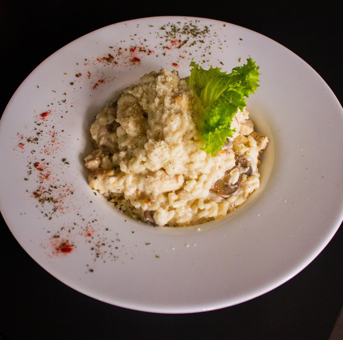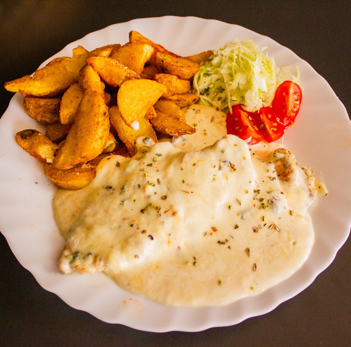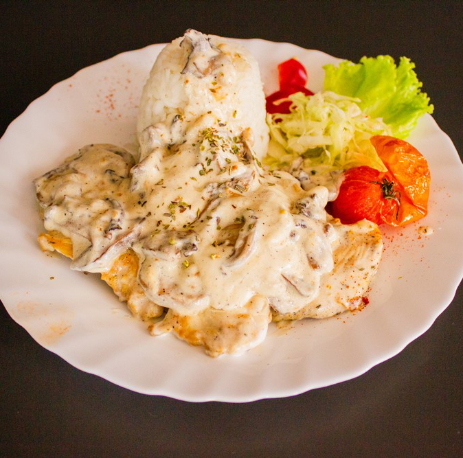 (200g pilećeg filea, gljive, riža, bijeli sos)