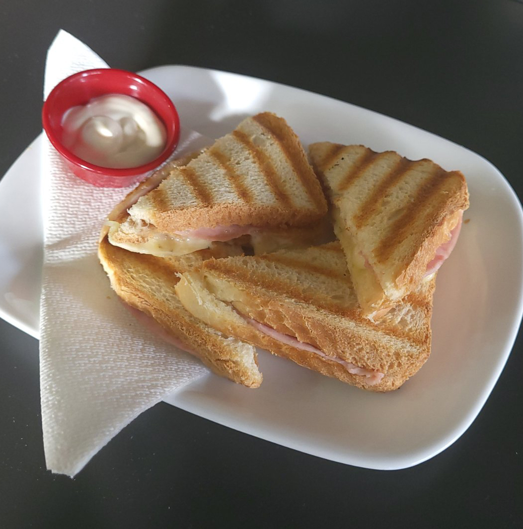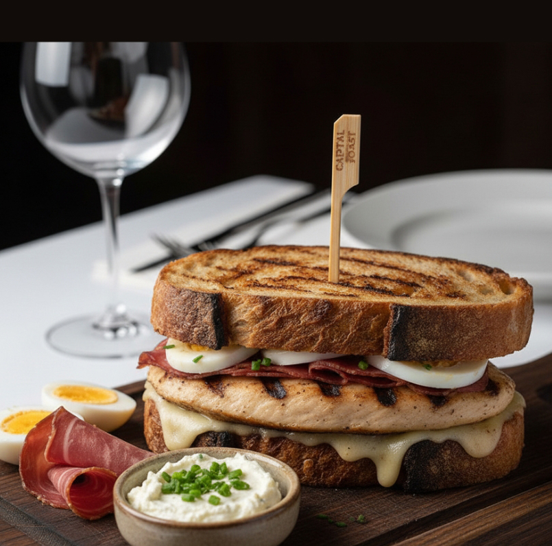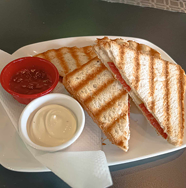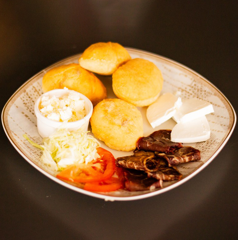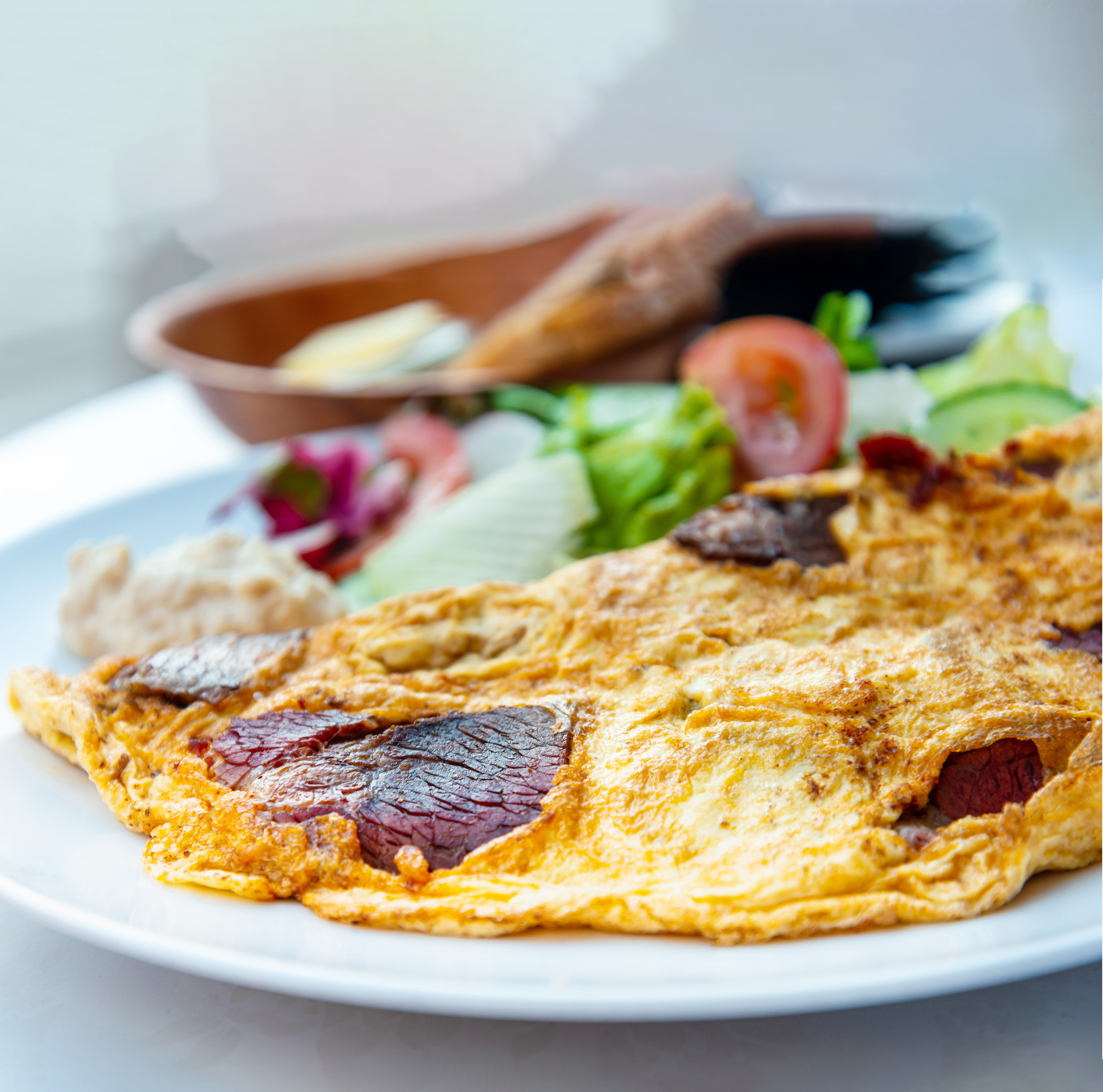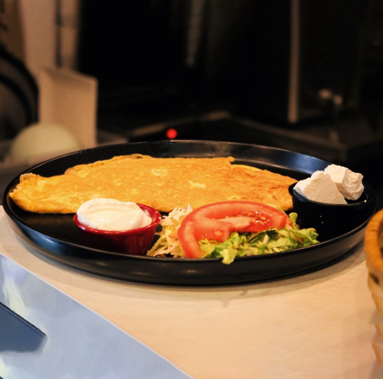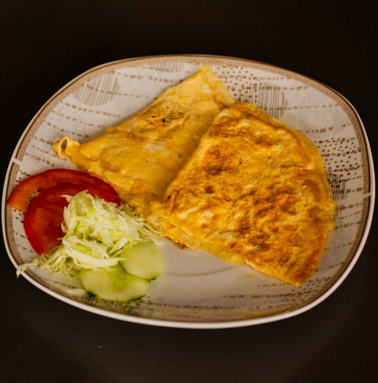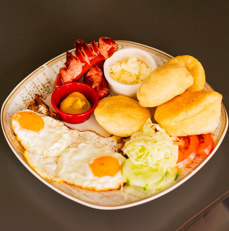 (2 x jaje na oko, 2 x kobasica, kajmak, senf, uštipci)