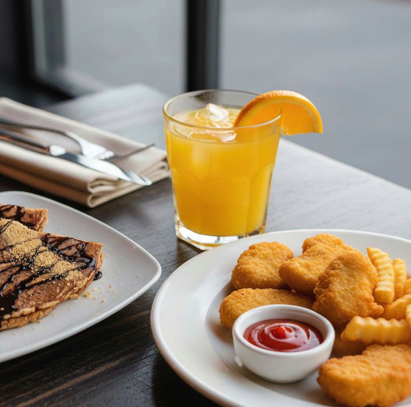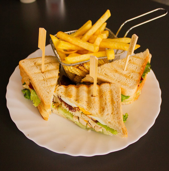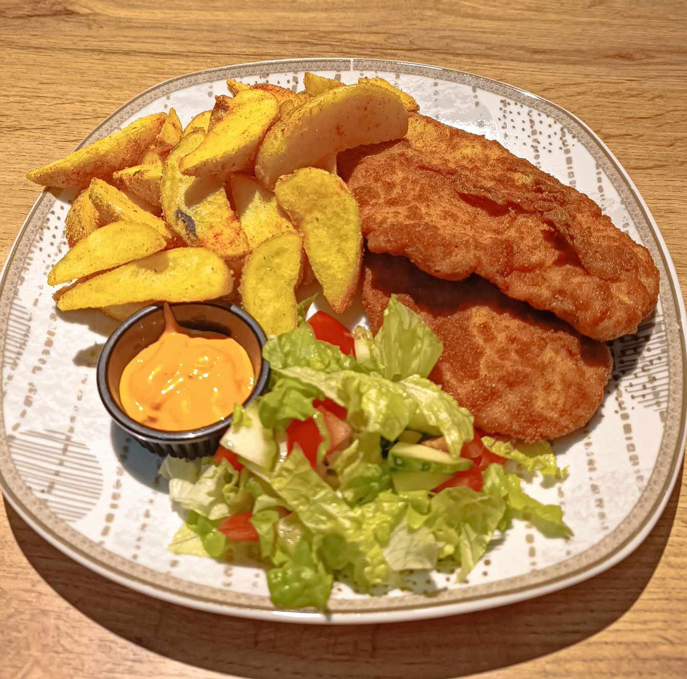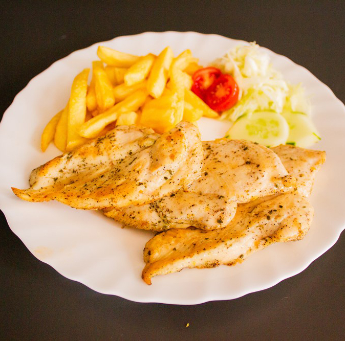 (200g pilećeg pohovanog filea, pomfrit, salata)