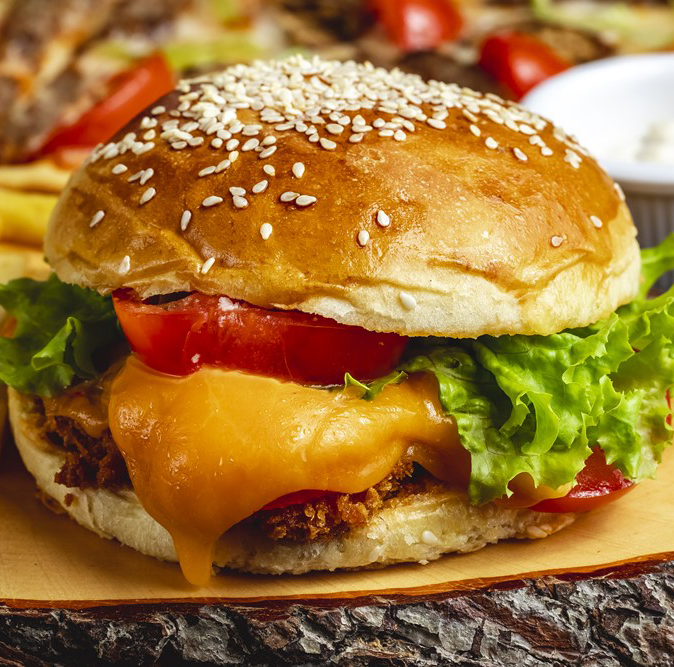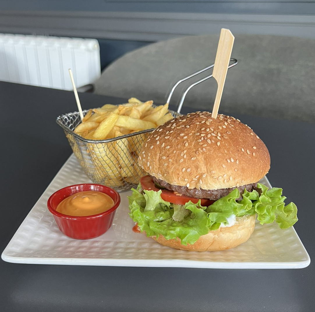(juneće meso, zelena salata, burger, krastavica, burger sos, cheddar sir, pomfrit)