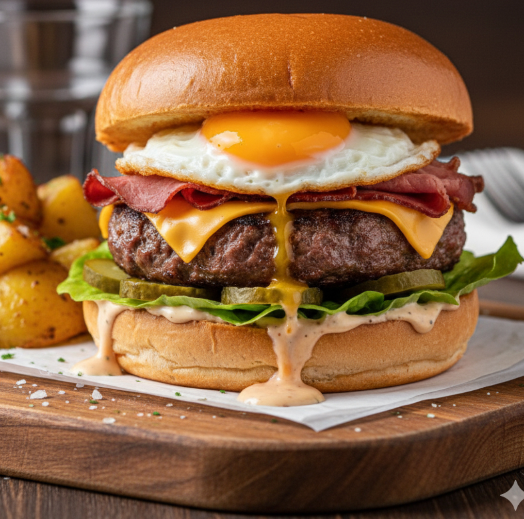 (juneće meso, zelena salata, jaje na oko, suho meso, burger krastavica, burger sos, pekarski krompir)