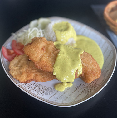 (200g pilećeg filea, curry sos, pekarski krompir, salata)