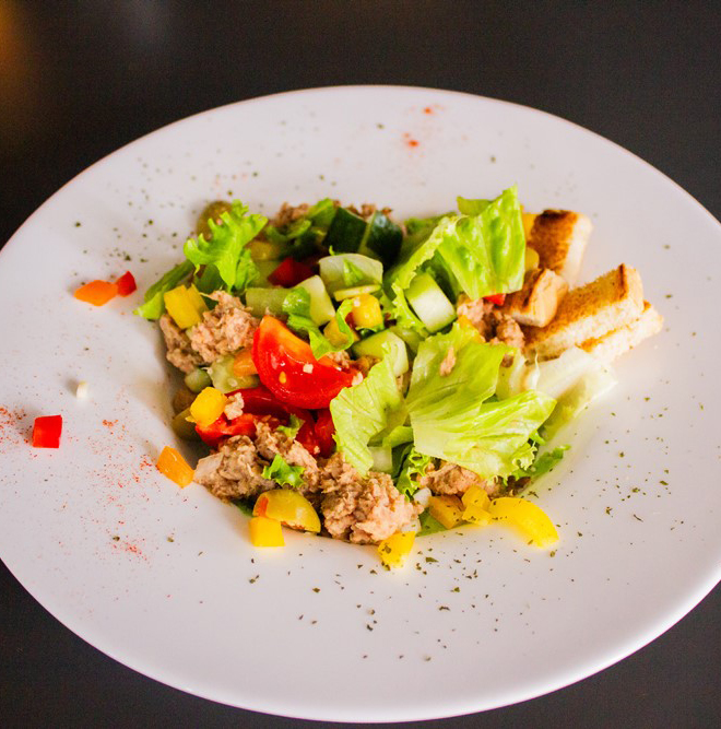 (tunjevina, zelena salata, cherry paradajz, kukuruz, paprika, dressing)