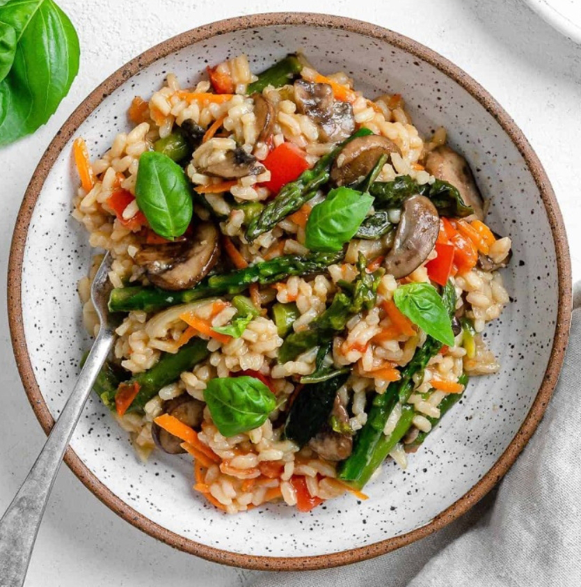 (200g pilećeg filea, crvena i žuta paprika, tikvice, gljive, riža)